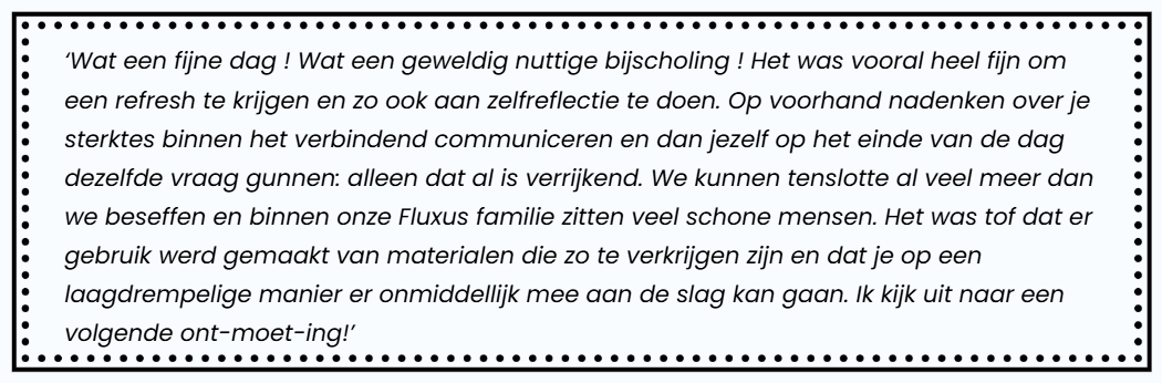 Naast de theorie en oefeningen (géén rollenspelen!), sta je in deze opleiding ook stil bij de vertaalslag naar de eigen schoolpraktijk: hoe kan je deze vorm van verbindend communiceren in je team én met leerlingen en ouders tot stand brengen?